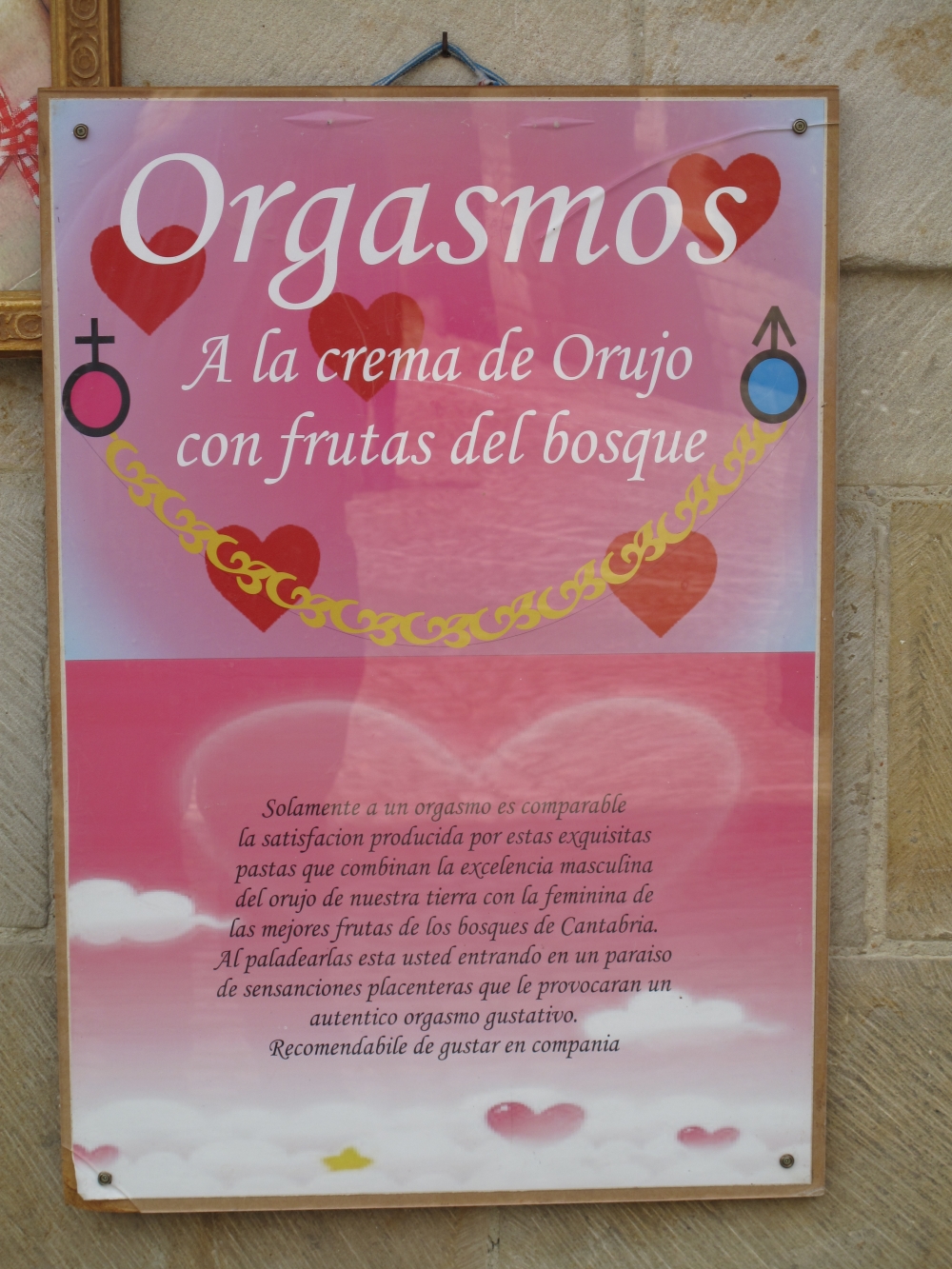 A second shop was selling ‘orgasm’ sweets made from ‘Crema de Orujo’, a weird Galician liqueur made from herbs, mixed with fruits of the forest. I think that the trade description act could have something to say about the claim that ‘only an orgasm is comparable to the satisfaction of eating these sweets….’.