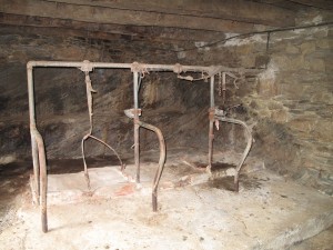 All of the downstairs rooms in the big house were originally used to keep animals, mainly so that the heat they gave off would keep the occupants above warm through the long cold winters nights. The room nearest to the farmland was designated as the milking parlour, come slaughterhouse. We don’t intend to keep cows, or indeed to get involved in too much slaughter, so the removal of the steel structure and breeze blocked stalls seemed a straightforward target for the morning.