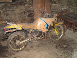 On closer inspection I discovered that we actually own a motorbike, hiding behind the stalls. It would go nicely with the two engines and other paraphernalia that were already on my scrap pile (still awaiting gypsies). This bike was complete, a yellow Suzuki trials bike, looking somewhat the worse for wear and unlikely to be taking part in any competitive cross-country scrambles at any time soon.