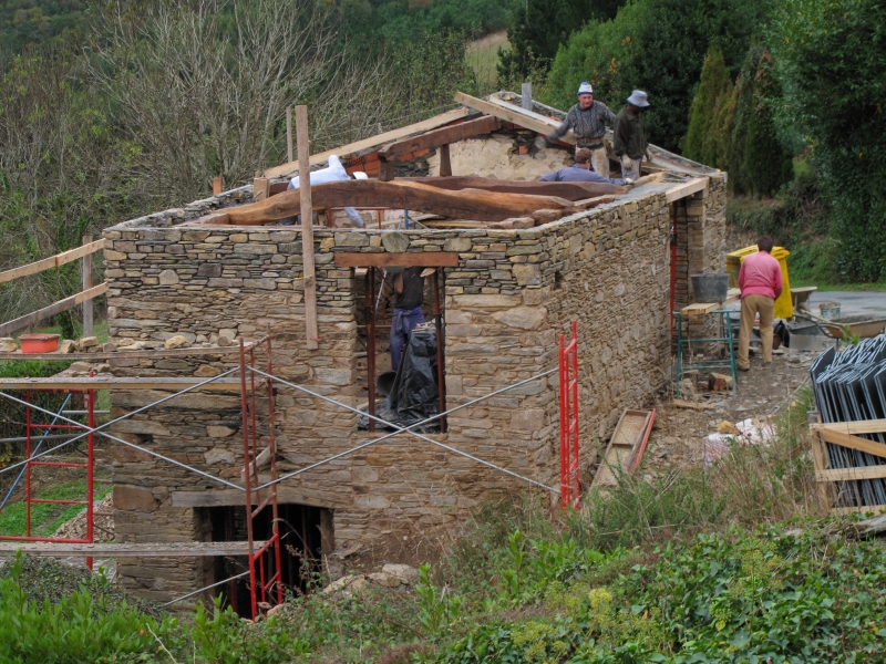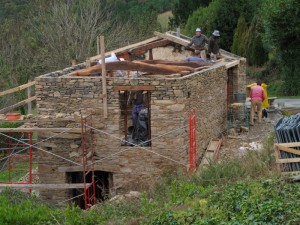 The house is still progressing a treat with the old beams, now cleaned and painted with a coat of protection, installed and starting to support the new roof frame. I left as it was starting to get gloomy but half expect that when I get up to the house in the morning that they will have finished.