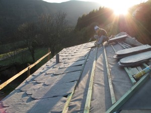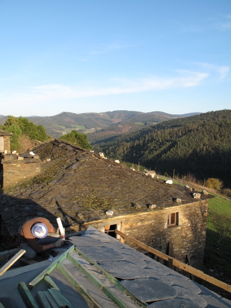 It was a perfect day for working outside, filling your lungs with fresh Galician air, sharing a joke with my multinational workforce, and catching some late November sun-rays which had us all down to short-sleeved shirts by mid-afternoon. I even ventured up onto the roof of the barn, when Facundo wasn’t on site…twice!