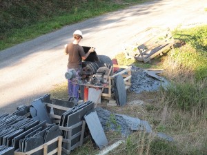 Looking back from the house, this is Arturo hand shaping the tiles, as he has been doing for the last three days, and still has two boxes full to cut.