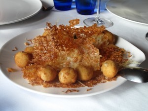 We opted to share three starters and after a delicious complimentary Asturian twist on Welsh Rarebit we opted for; Asturian Cheese Croquettes; a warm mushroom and fruit salad; and pan fried sep mushrooms.