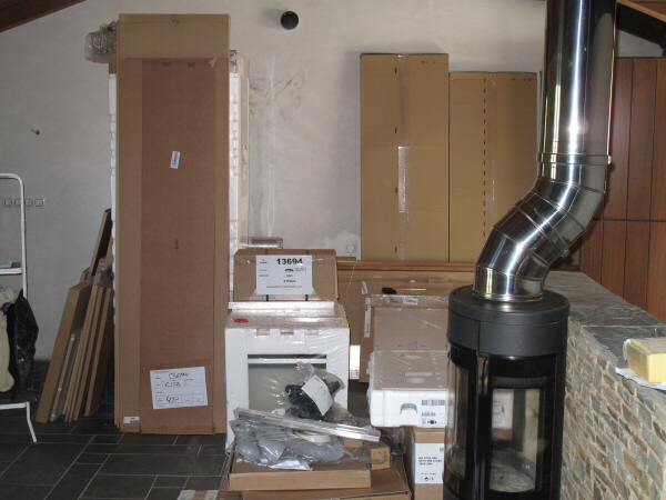This was the scene which greeted us arrival at the barn at the start of last week. Lots of lovely brown boxes packed with kitchen parts, all freshly delivered by IKEA and awaiting the fitter who was booked for Thursday and Friday.