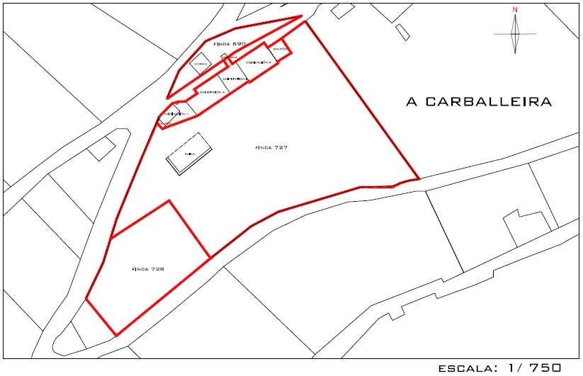 Inma humoured us and found us a local surveyor in Ribadeo who was contracted and sent to the house armed with theodolite and tape measure. Within a couple of days his report, for want of a better description, arrived with three pages of text (in Spanish), lots of photographs of the house in the sunshine (which was nice because we’d only really seen it in the rain), and a nice plan (see below) showing the extent of the land that comprised the titles on the market.