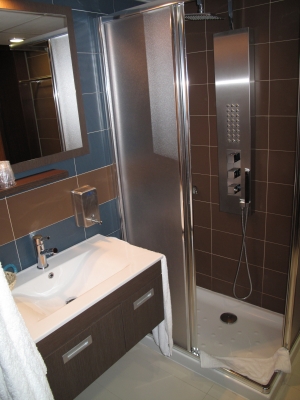 But the main reason I mention it is the wonderful job that Jose Carlos and his builders have done in renovating a shell into such a delightful hotel, with many features similar to those that we’d like to have in our Casa Rural. Starting with the bathrooms, bright, modern, well lit and with top-of-the-line installations such as this amazing multi-function walk-in shower.
