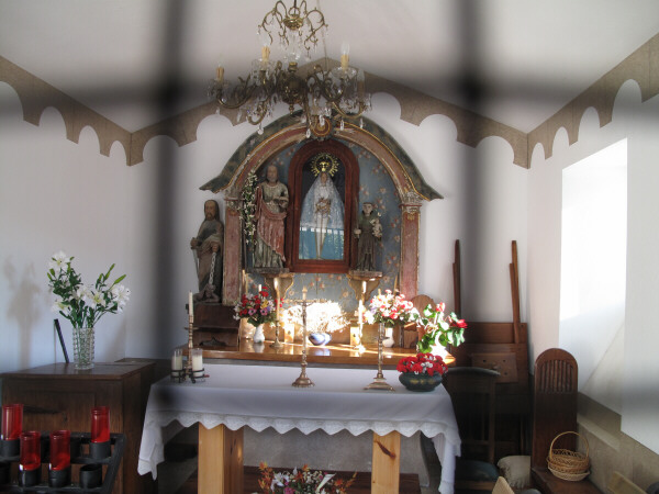 Enclosed on three sides the fourth is open to the elements and protected just by a wire mesh arrangement. Inside is a small altar with the ubiquitous icons and a couple of small pews which could, at a push, seat three people each.